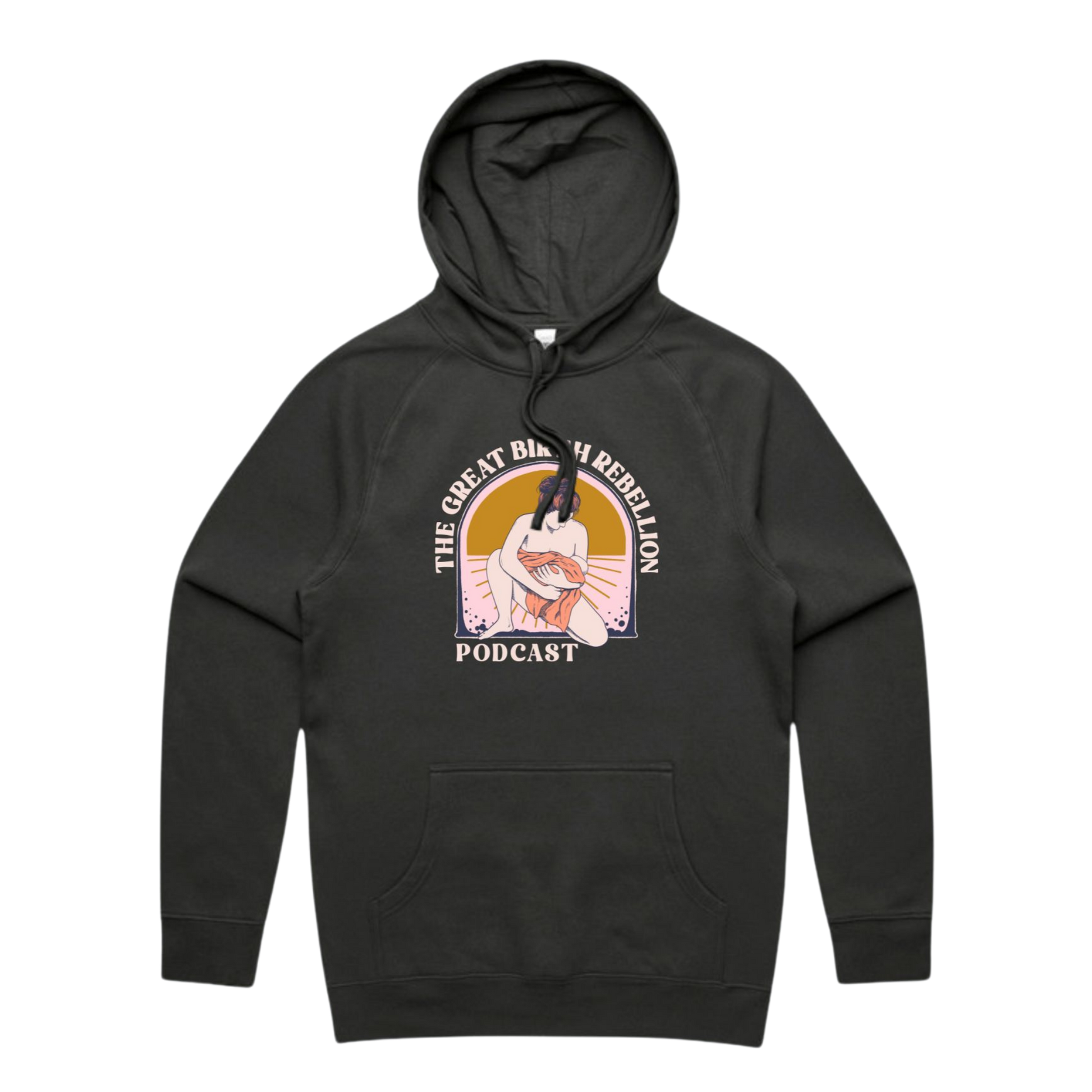 This regular fit hoodie with a large logo on the front. This hoodie is designed to show others that you are a person who knows the research, listens to the podcast and believes women should have control over their own births.